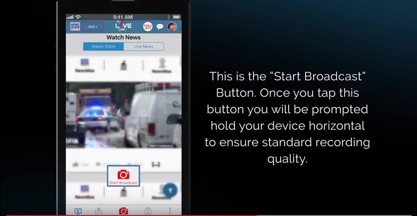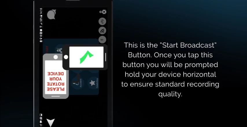 This is the Start Broadcast Button. once you tap this button you will be promopted hold your device horizontal to ensure standard recording quality.