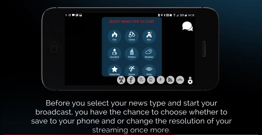 Once your device is rotated, you will be prompted to select a news type. Before you select your news type and start your broadcast, you have the chance to choose whether to save to your phone and or change the resolution of your streaming once more.