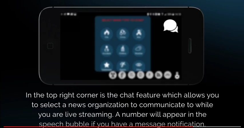 And switch from back facing camera to front facing camera. These buttons can be hidden by tapping on the gears button in the lower right corner. In the top right corner is the chat feature which allows you to select a News organization to communicate to while you are live streaming. A number will appear in the speech bubble if you have a message notification.