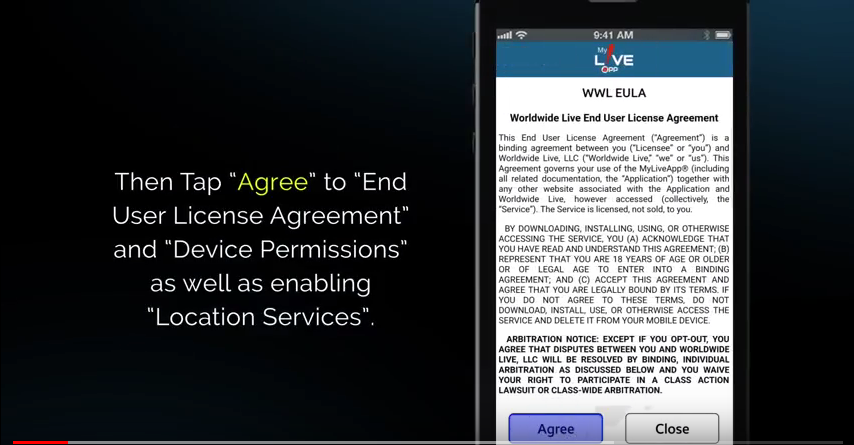Then Tap “Agree” to “End User License Agreement” and “Device Permissions” as well as enabling “Location Services”.