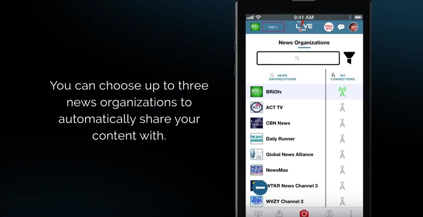 You can choose up to three (3) News Organizations to automatically share your content with.Tap the icon to the right of your favorite Organizations to add them to your list.If you can’t find your desired Organization, you can search for it Here.Now that your Connections have been set up, tap “My Live